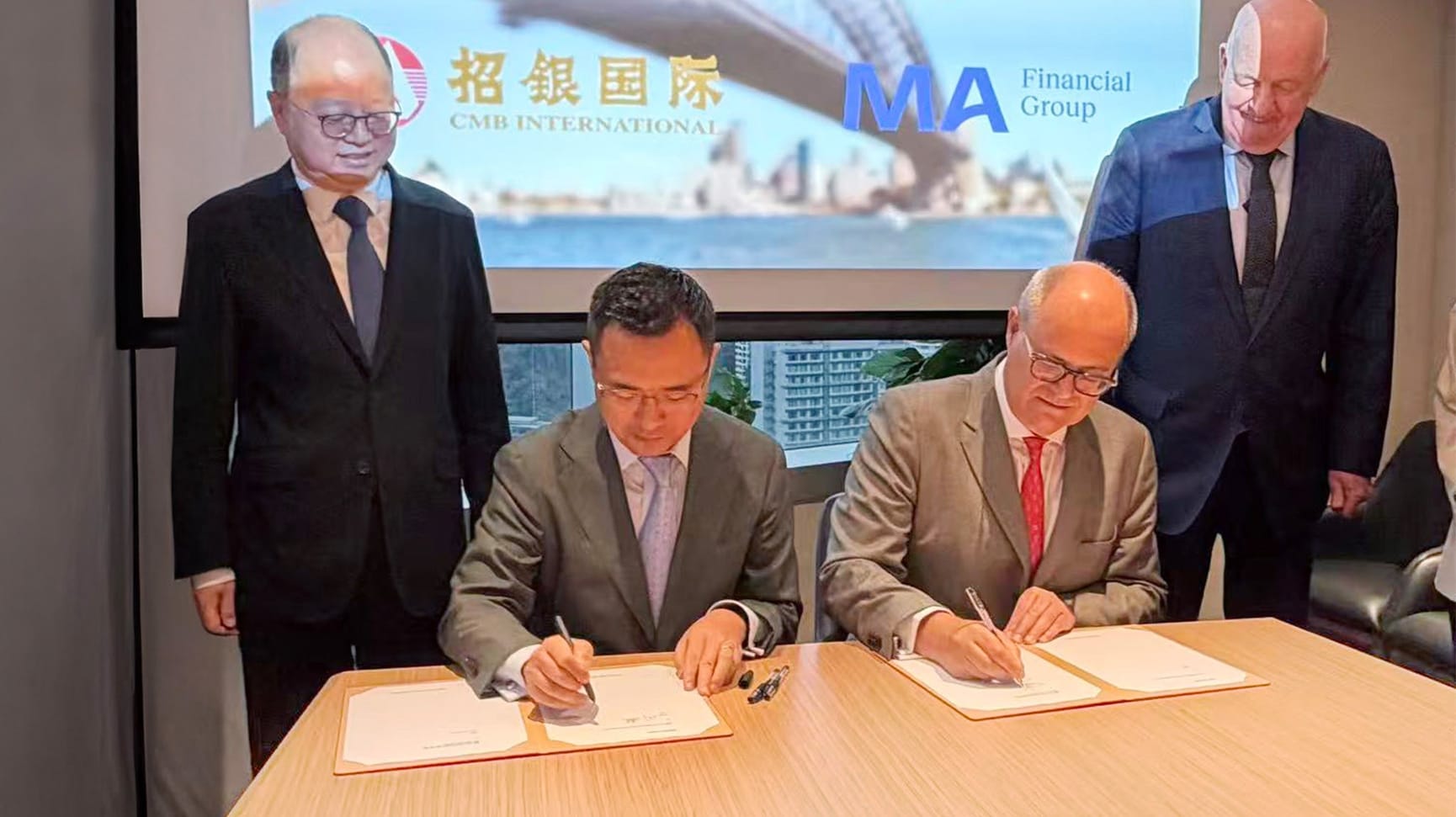 簽約儀式照片從左至右 – 招銀國際首席執行官霍建軍;招銀國際結構融資部主管何毅(Barry He);MA美馳澳洲資管部總裁Andrew Martin;MA美馳澳洲董事總經理 Alan Reid
