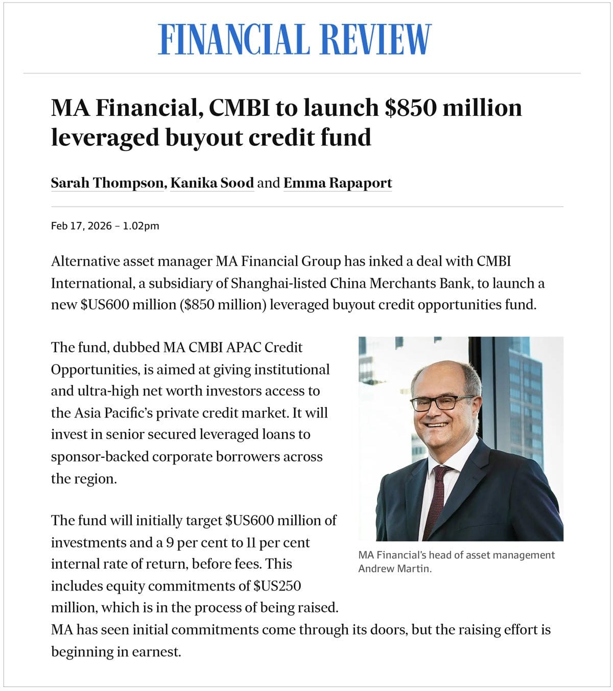 2026年2月16日,MA美馳澳洲與招銀國際( CMB International )達成戰略合作,聯合推出目標規模6億美元、面向機構及超高凈值投資者的亞太信貸投資產品。本次合作不僅標志著雙方在私募信貸領域的深度協作與優勢整合,更彰顯了國際領先金融機構對 MA 美馳澳洲投資管理能力與平台實力的高度認可,雙方將共同打造一個兼具全球視野與區域深度的專業投資平台,為全球機構與高凈值投資人提供參與亞太優質信貸機遇的重要通道。