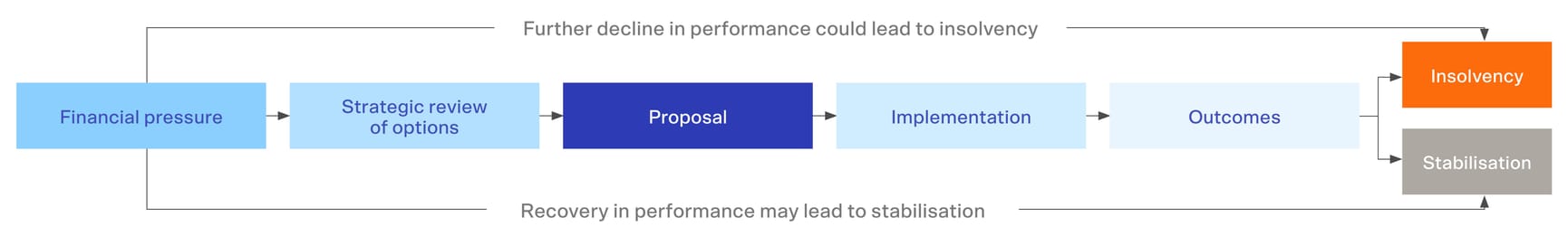 - Outcome: ideally the company is stabilised before an event of default or uncontrolled insolvency occurs. If a stabilisation isn’t possible, a formal insolvency processes may result such as an administration or receivership.